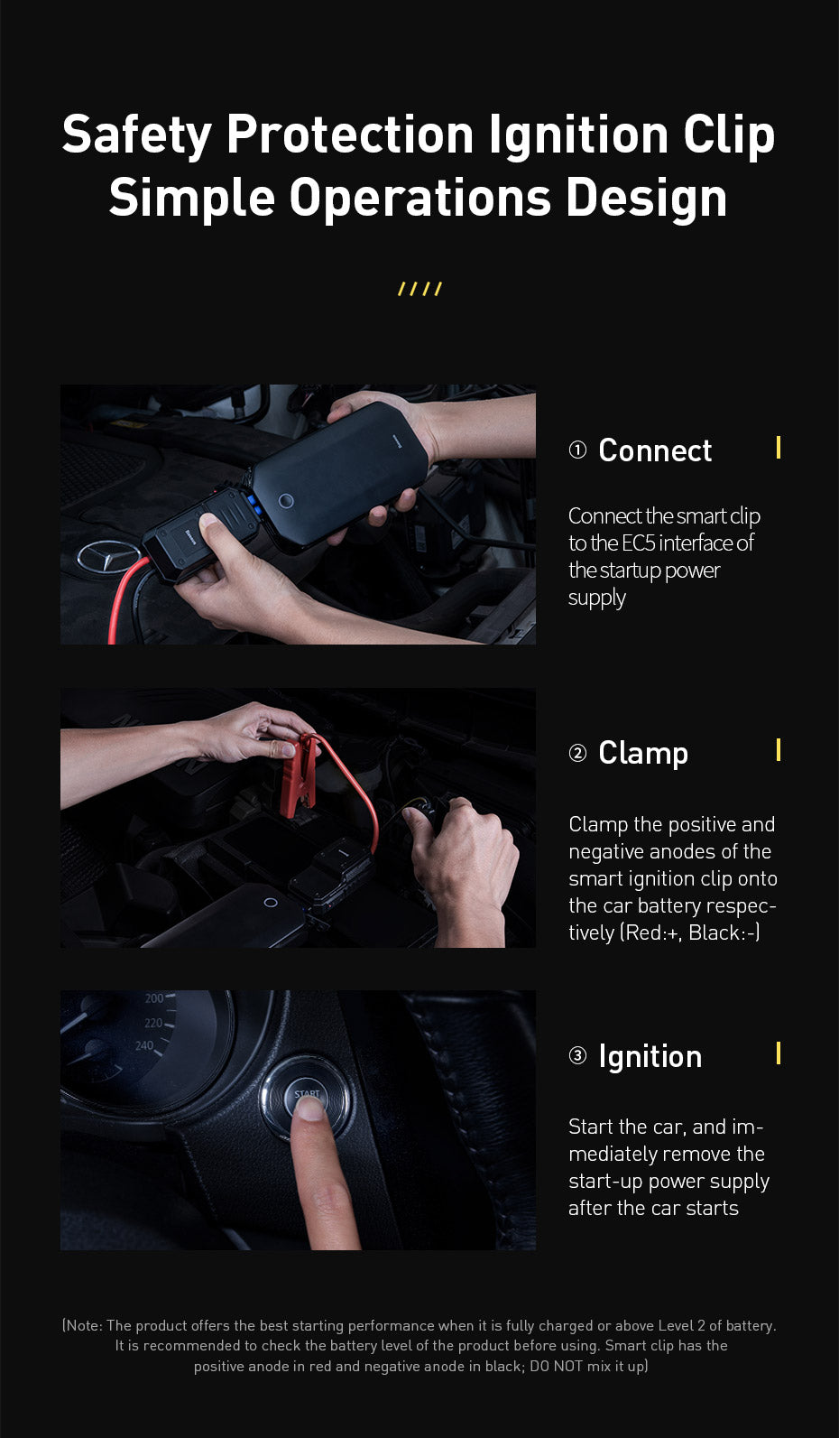 2. Sujete los ánodos positivo y negativo del clip de encendido inteligente en la batería del automóvil respectivamente (Rojo: +. Negro: -)